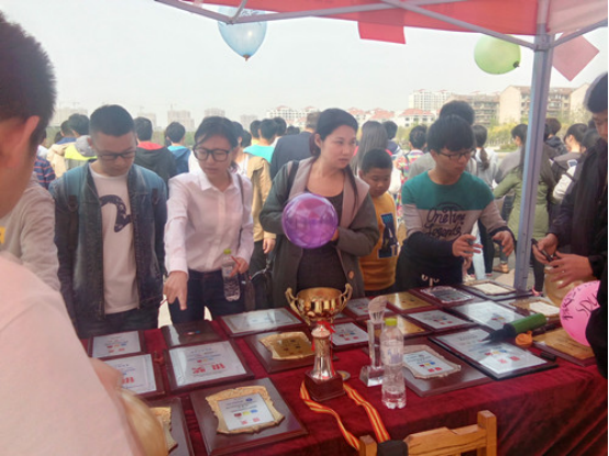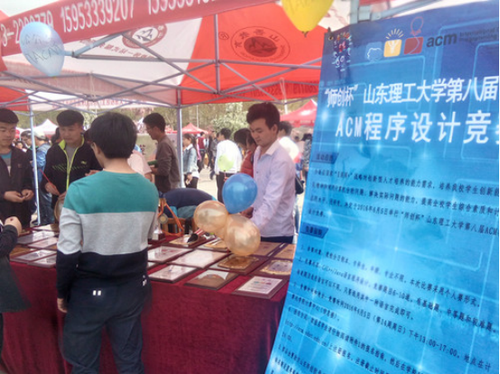 活动伊始,ACM社团众会员齐上阵,在稷下湖畔小广场上抢占有利位置,支起遮阳的帐篷,摆好桌椅,张贴海报,并将ACM社团在2015和2016年获得的奖牌整齐的摆放在桌上。活动开始后不久,ACM社团场地前驻足的老师和同学就络绎不绝。同学们都被桌子上大大小小的奖牌、证书和奖杯震撼而驻足观看。ACM社团的成员热情的为大家讲述这些荣誉的来历,脸上充满了自豪。同时,社团成员们将事先准备的气球发放给前来参观的同学并不失时机地向同学宣传讲解即将在6月5号举办的“师创杯”公司第八届ACM程序设计竞赛。许多同学们都热切的表示希望能够通过此次竞赛来锻炼一下自己。整个活动过程始终有序地进行着,直至活动结束。