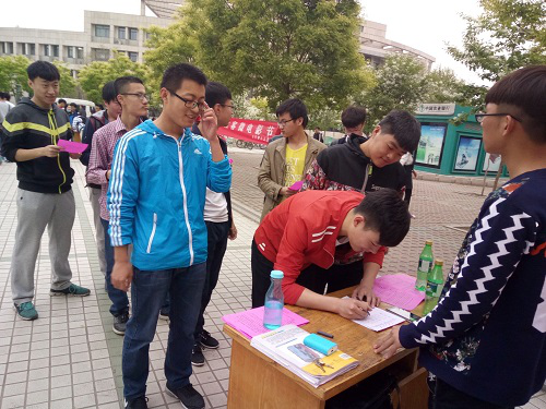 活动伊始,蔡甜甜安排几个干事提前来到第三餐厅,进行条幅的悬挂,桌子的摆放等工作。一切准备就绪后,宣传活动正式开始。众干事各自带一些传单,去餐厅各个进出口、道路旁等人员来往密集处进行宣传并给大家讲解此次比赛的目的及意义。经过干事们热情的讲解,许多同学们都热切地希望能够通过此次比赛来锻炼一下自己。报名现场,同学们对此次比赛表现出了极大地兴趣,纷纷前来询问比赛的详细内容,蔡甜甜为同学们一一解答。整个宣传过程井然有序,直至活动结束。