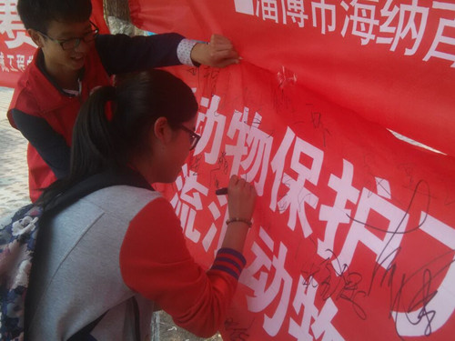 此次签名宣传活动,小水滴成员齐上阵,在三餐附近进行了热烈而广泛的签名宣传活动。活动伊始,由宣传人员负责整理桌椅、张挂条幅,一切准备就绪后,小水滴的宣传成员们手捧着宣传单,到餐厅的各个进出口、道路旁边等人员来往密集处进行宣传讲解,邀请同学们在横幅上留下自己的签名,社团成员们全心全意的为此次宣传活动贡献自己的力量。经过成员们热情的讲解,许多同学们都热切通过签名来表达自己对保护动物的关切之心。整个宣传过程始终井然有序的进行着,直至活动结束。