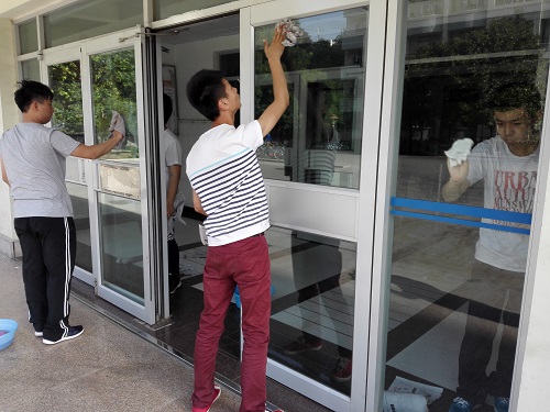 活动伊始,员工会主席路广智分配并安排任务,力争高效率、高质量的完成此次大扫除活动。任务分配后,各干事分别领取卫生工具,各就各位,各司其职,兢兢业业的完成自己的本职工作。大扫除活动男女生宿舍楼同时进行,宿舍楼的玻璃大门、公共洗漱间的窗户及自行车区等,都有同学们辛勤忙碌的身影。为了达到不留卫生死角的高标准,同学们分工明确,各显其能,负责扫地的争取不留一片纸屑,负责擦玻璃的力争让玻璃不沾一丝尘土。自行车数量多且摆放杂乱,负责自行车摆放的任务最为艰巨。同学们一辆辆、一排排认真摆放,出色的完成了这场攻坚战。负责教学楼的同学认真打扫教学楼周围的绿化带及路面卫生,并将楼道瓷砖认真擦拭,使教学楼给人焕然一新的感觉,也为同学们学习创造了良好的环境。在大家忙碌的身影中,此次大扫除活动结束。