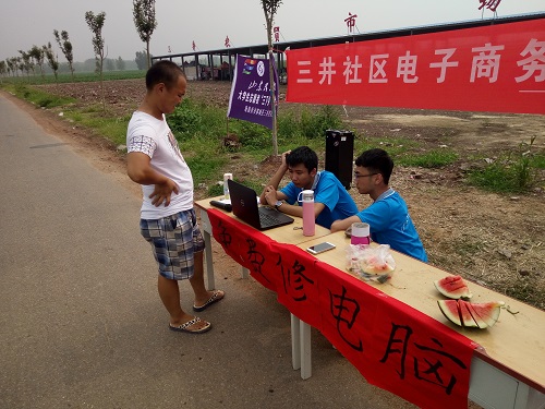 早上6时,公司“E行天下—赴三井社区”实践团便准备好桌子、音箱等宣传物品在市集口忙活起来,挂条幅、调音箱、分传单,实践队员分工明确,有条不紊。实践团此次宣传活动以“免费修电脑”、“电脑知识宣讲”等形式展开,主要是为附近村民免费服务与讲解关于电脑方面的知识,很受村民欢迎,人们纷纷靠近询问情况,队员们也就村民们的问题一一作出解答。此次中国海洋大学宣传活动主要进行的是“社会保障”、“医疗保险”等方面的宣传,此次宣传不仅通过单页宣传、口头宣传等形式进行,而且也在市集口实际帮助村民解决生活上的问题。有些年纪比较大的中老年人比较关心的是有关医疗保险以及住院报销等的问题,围着队员们细细的询问,队员们也耐心的讲解;有些比较年轻的村民更加关心的是电脑方面的知识,纷纷向前询问。“E行天下—赴三井社区”实践团通过免费修电脑的形式进行宣传,不仅让更多的人更深层的接触到电脑方面的知识,而且通过帮助村民修理电脑,为村民做实事,更加得到村民对工作的支持。