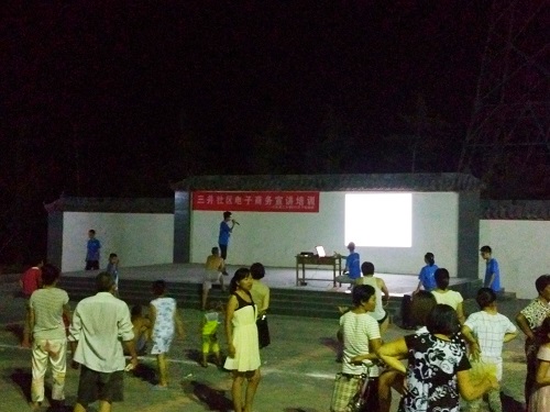 队员们很早便来到中心广场,进行宣讲培训的准备工作,摆放桌子、调试投影仪、准备演讲稿、挂横幅,有条不紊。在队员们准备期间,村民们也都慢慢聚集过来,一部分在专心的看着队员们准备的电影;一部分在好奇的询问着关于电商的问题;也有一部分在互相讨论着有关社区发展的相关问题,队员们对村民的疑问都一一耐心解答。晚上八点,宣讲培训准时进行,首先张城依次介绍实践团成员,以及实践团的基本工作情况,为村民简单说明实践团此次社会实践的内容以及有关电商发展方面社会大趋势。而后,队员孙志鹏、石少艳通过歌唱表演的形式吸引村民的注意,村民纷纷走向前来。孙志鹏通过演讲解说与播放视频PPT的形式,结合三井社区的实际情况为村民详细介绍了互联网的发展、电商的必要性、电商的成功案例、当地经济产业与电商的结合等有关此次社会实践的内容。随后,苏瑞翔、盛振明通俗易懂地向村民们介绍淘宝、支付宝、微信等APP的应用。因为这些APP比较贴近生活,很多村民纷纷拿出手机跟着队员们的讲解操作着,也有部分村民在讨论着现在互联网对生活的改变。在培训最后,很多村民便主动找到队员了解关于电商的相关内容,其中他们很多提到自己也很想建立一个这样的平台,但是因为没有技术,在网上的学习对于他们来说太难,所以一直没有办法开展,他们也表示很欢迎实践团明年社会实践也会来到三井社区,他们会给予大力的支持。