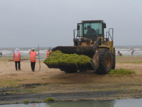 海边被浒苔覆盖,沙滩上已经变成了绿色地毯,这些浒苔好像来的还真是这么个时候,蓝色海洋实践队搞环境保护就涌出来了,日照市政府的办事效率也是极好的,一出现浒苔立马就有环卫工人来打扫,而且还调来了挖掘机积极清理,在实践队眼里看来海洋保护真的是刻不容缓的一件事,队员们和工人们交流了清理浒苔的体会,在海边捡拾垃圾,一定要为心中的蓝色海洋做点实际的了!