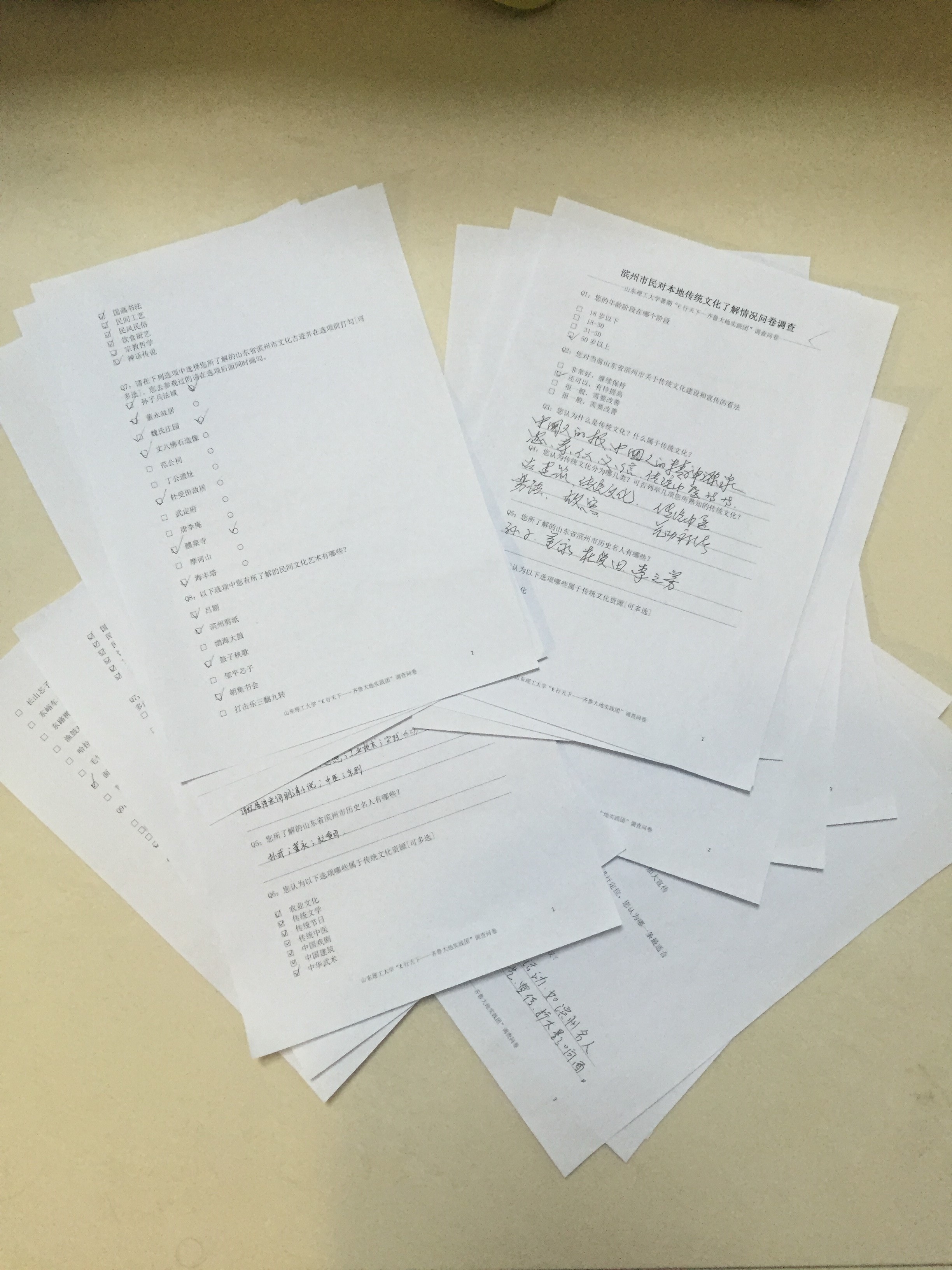 在实践团队开展调查的前一天,队员们积极搜集各自地区的传统文化涵盖范围及内容,针对家乡特色及自己对传统文化的了解和疑惑,分别制成各地区市民对本地传统文化了解情况调查问卷,打印下来存档。准备工作已完成。