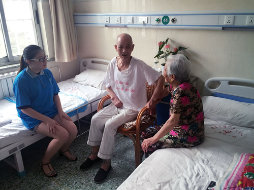 因为我国医疗和养老系统长期割裂,卫生系统管医疗,民政系统管养老,造成养老机构与医疗机构功能单一化。养老机构“养老不医护”,而医疗机构是“治病不养老”,两者这并不对接,对养老和医疗问题带来了诸多不便。实践过程中,其中一对老夫妻给实践队员们留下了深刻的印象。8月10日队员们像往常一样进行着社会实践,看到一个老爷爷和老奶奶散完步,老奶奶正扶着老爷爷回病房,这时,队员们上前打招呼问好,决定帮老奶奶扶老爷爷进病房,护士长向老奶奶介绍了队员们后,老奶奶很欣然接受,于是大家在交谈中搀扶着老爷爷进入病房。扶老爷爷坐下后,队员把买来的西瓜给了爷爷奶奶,并和他们聊天,聊天中得知爷爷得了失语症,他是枣庄市财政局退休多年的老干部,老奶奶说她有时也不懂爷爷在说什么,但看起来爷爷很活泼,一直用手比划着跟队员们交流,队员们给爷爷奶奶倒了水,洗好水果,陪爷爷奶奶聊了一个上午,队员们深刻的意识到陪他们的重要性,他们有时候就和小孩子一样,更需要关心和照顾。度过了这开心却又有些伤感的时光,临走时爷爷奶奶很不舍得,奶奶送队员们走出房间,爷爷也挥了挥手,队员们心中充满了感动和快乐。