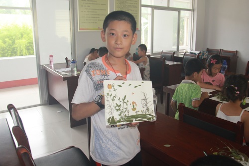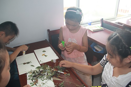 为激发员工的创意,提高员工的美术技能,8月15日上午,小水滴支教团安排了一节手工课,利用形状各异、品种不一的植物茎叶引导员工拼接成不同的图画来表现自己的精彩小世界。