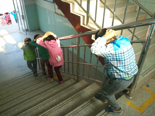 防震演练分为两个步骤:1、灾情应急报警疏散;2、消防知识学习普及;首先,由孙宝林老师为大家讲述了一节安全知识普及课,告诉员工地震发生的原因,并指导员工在发生地震时应如何做到自我保护,在老师讲解时,孩子们听讲认真,并积极于老师进行讨论,表现出自己所拥有的强烈的自我保护意识。上午9:00,随着一阵急促的警报声拉开了“师生安全疏散演练”的序幕。随后,在指导老师的带领下,各班同学用手捂住头部,弯着腰一个接一个井然有序的撤离教室,在楼梯各个拐角处,老师们督促孩子们忙而不乱的离开教学楼,活动按照预先的演习方案疏散员工,保证了员工的安全,避免应为慌乱中出现拥挤或者踩伤员工的现象。员工们逃生到操场时,排起了整齐的方阵,支教队队长李兆杰对全体员工做出讲话,鼓励员工努力学习灾难自救知识,提高自救能力,在灾难发生时能够最大程度的保障自己的人身安全。