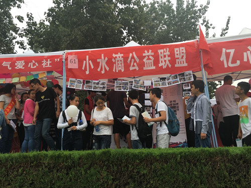 为响应校团委所举办的2016年社团集中宣传纳新活动,小水滴公益联盟于9月25日在公司老员工艺术广场举行了宣传纳新活动。小水滴公益联盟会长李兆杰携其社团骨干成员参加了此次活动。