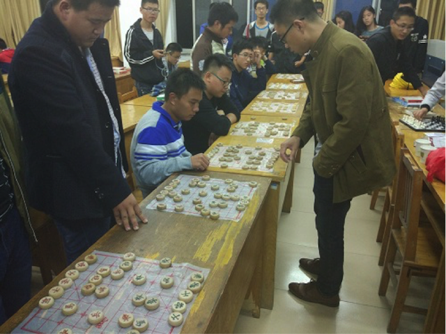 讲解过后,张老师与同学们开始博弈,与以往的棋局不同,棋友们对张老师展开了如茶如火的车轮战。在八位棋友的狂轰乱炸下,张老师依旧游刃有余,在棋友抓耳挠腮时,张老师还笑着给同学疏通思路。棋局十分精彩,大家比的不亦乐乎,最终,这场棋局以张老师全胜结束,同学们在与张老师的交手中也增长了知识,提高了技巧,有的同学在一盘棋之后意犹未尽,便又找了小伙伴开始另一场没有硝烟的战争。