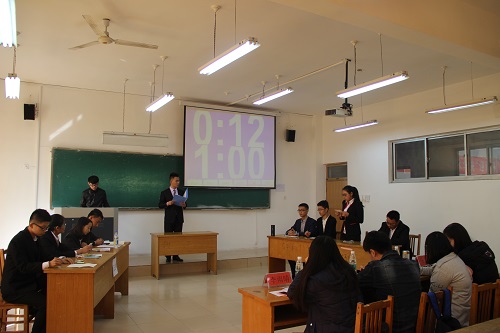 比赛流程共分为开场陈词、攻辩、自由辩论、总结陈词四个环节,主持人介绍完比赛流程与注意事项后比赛便正式开始。比赛伊始,对评委及正反双方选手进行了介绍,接着,双方一辩各自开篇立论各自阐明观点。随后在攻辩环节中,辩手们或言辞激越,掷地有声,表明自己的观点和看法;或细心品味,舌灿生花,抓住对方言语里的漏洞,予以有力回击。接下来自由辩论环节,更是将这种气氛推至顶峰,双方辩手抓住对手的语言漏洞巧妙反驳,辩手们在这场特殊的“战斗”中,围绕各自主题,大展风采。比赛在双方四辩陈词总结中进入尾声,他们激烈的唇枪舌战,充分展现了其语言的艺术、辩论的魅力和个人的实力。最后,各位评委针对双方队员们的表现进行点评,指出他们的优点和不足。并评选出获胜队伍和最佳辩手。辩手们得语言严谨犀利,又不失幽默气氛,现场掌声不断。整场辩论赛气氛活跃,为同学们带来了一场雄辩滔滔的听觉盛宴。
