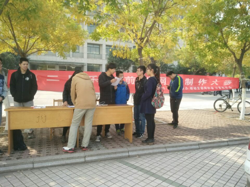 宣传开始前,工作人员拉起横幅,搬来桌椅,做好了充分的准备,保证了宣传活动的顺利举行。随着员工们的增多,骨干们积极地对过往的同学进行宣传,耐心地为同学们讲解了比赛的具体内容。同学们对此次网页制作大赛产生了浓厚的兴趣,不少同学现场决定进行报名,并对此次比赛充满着信心。