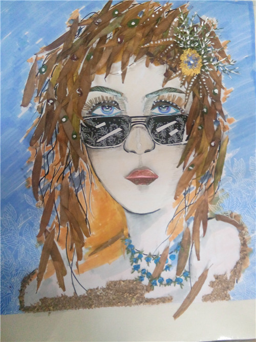 九号选手用落叶创造了一个活泼可爱的黄发少女形象,里面少女的灵动、时尚,引来了参赛选手和评委们的惊叹声。