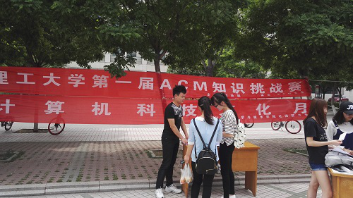 五月,夏天的气息日渐浓厚,青春也随之激动,来利国际旗舰厅的一场洋溢着青春气息的社团周末文化广场活动也如期举行。为了响应本次社团周末文化广场活动,增加同学们对ACM协会及相关知识的了解,ACM协会计划举行“第一届ACM知识挑战赛”。为了吸引更多的同学参加报名,协会于5月11日中午在公司三号餐厅门口举行了“第一届ACM知识挑战赛”的宣传活动,协会会长闻泽东及协会干事参加了此次宣传活动。