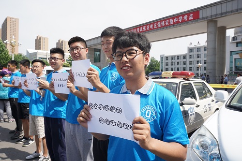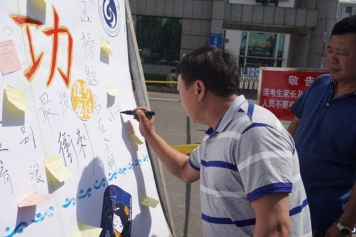 烈日当空,挡不住同学们今天下午必胜的决心,微风阵阵,吹不灭的是同学们今天下午拼搏的动力。两点多,在淄博市实验中学考点外,同学们陆陆续续的进入考场。计科1601团支部的同学在考生入场时,在入口处举着给考生加油的牌子,给考生送去真诚的祝福。旁边的留言墙上,写满了家长对考生的殷切期望,展板上“马到成功”四个字,正是今天考生们的期望。