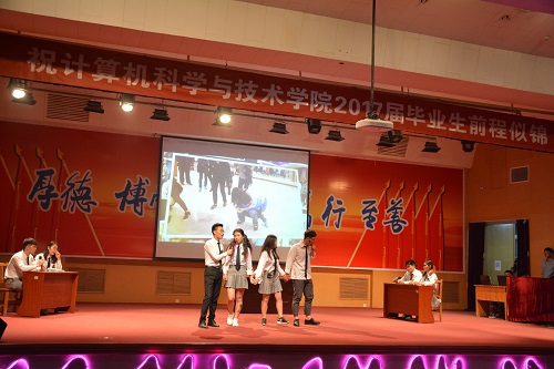 踏拍起舞,舞动青春。一场开场舞后,晚会正式拉开帷幕。首先,由孙成状为毕业晚会致辞并献唱。他的讲话,表达了对毕业生的祝福,并从责任、价值、情感三方面为毕业生送上了三句话,他的歌声,蓝天白云,羊群奔跑,表达他对员工们未来的美好祝愿。紧接着,宋吉江也以一首《北国之春》,唱出了对毕业生浓浓的祝愿和期许。晚会现场,歌曲串烧、舞蹈表演、小品等轮番上阵,老师和同学个个都摩拳擦掌,好不热闹。其中,《歌曲串烧第一弹》,三段歌曲的结合,加上表演者颇具风格的嗓音,一出场,就引得现场欢呼声不断;舞蹈串烧,演员们以灵动的舞姿,给现场观众们留下深刻的印象;来自校园十佳歌手的两位同学,也以一曲《日不落》,展现了他们的功底。作为晚会唯一的小品《碰瓷》,其特色的语言演绎和情节构思,也博得阵阵掌声。辅导员们也不甘示弱,一曲童真感十足的《大王叫我来巡山》,原创歌词的加入,更是展现了他们的活力。另外,稷下湖乐队也现身晚会,倾情演绎《告白气球》。除了展现员工才艺的精彩节目外,还有许多以回忆、离别为主题的表演。《难舍难分》、《不说再见》、《歌曲串烧第二弹》、《那些年》等,朗诵《我们毕业了》更是将这种气氛推至高潮。最后,晚会在《毕业歌》中,圆满结束。