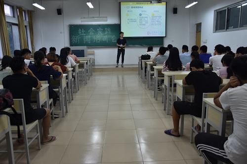 培训会伊始,蒋兴旺以PPT的形式给同学们分点分部展示并讲解新闻基本要点以及写作基本知识。培训过程中,他介绍新闻基本六要素,同时对新闻写作方法进行详细的讲解,强调了标题、导语、主体、背景以及结语新闻五部分的重要性以及具体要求,并结合例子给同学们一一说明难易点。他重点讲到新闻注意事项,其中包括新闻格式、文体符号、时间地点、称呼严谨性、避免主观性以及投稿方法等等。随后,由张晓桐讲解摄影知识。她从专业角度说明摄影方法,包括姿势、相机用法、照片类型以及新闻照片要求,强调了不同场合拍照的注意事项。同学们认真听讲,积极记下重点内容,蒋兴旺与张晓彤的细心讲解,让同学们有效解决相应的新闻和摄影问题,给予社会实践团队很大帮助。最后,由公司员工会实践部部长贺晓培再次强调社会实践活动前准备、过程要求以及结尾总结,并告诉大家认真完成社会实践,在此次活动中获得真正收获。