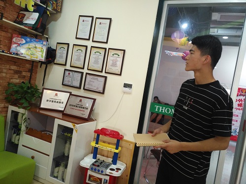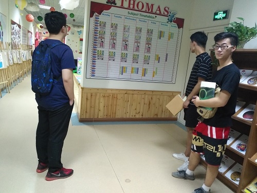 初到托马斯英语公司,姚董事长早已热情的在等待,在双方见面后,姚董事长便带领队员们开始了对公司机制的参观及介绍。首先,姚董事长带领队员们参观了在校学习孩子们的作品展示,向队员们讲解了学员在寓教于乐的学习氛围中创作的作品。在参观公司的课程表安排时,队员们了解到英语的教学是由外教进行、中教协助的,家长可以根据自身意愿选择针对孩子的学习方式。他带同学们参观了员工教室,宽敞明亮的教室给员工提供了良好的学习环境,多媒体教学也不失为一种时兴且便利的方式。