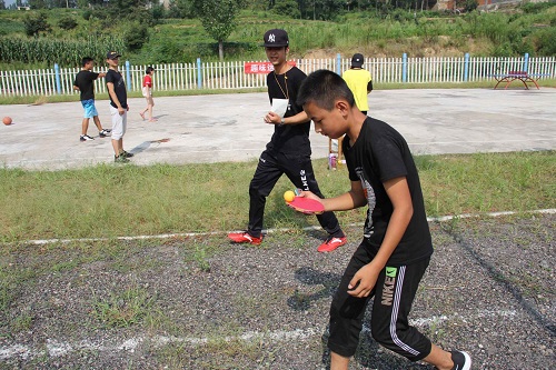 活动伊始,进行趣味接力赛,由高低年级员工搭配组合完成,首先是乒乓接力赛,乒乓球接力赛主要是考验孩子们的运球技巧与心理素质,孩子们全神贯注地盯着拍子上来回滚动的乒乓球,在前进的途中弯着腰尽全力维持着球的平稳。如果掉下,就要返回原点重来。这个环节是最耗费时间的环节。有几个年级较小的同学,平衡力较差,一直卡在这关过不去,最后队员紧急调整了政策,掉一次球就加5秒,比赛才得以顺利进行。最有趣的是自转五圈之后带球一段距离然后射门,其中有几个员工转完圈后摇摇晃晃的样子引得参赛者开怀大笑,让场上的气氛活跃了起来。比赛中,出乎意料的是一开始大幅度落后的队伍,最后一棒时,由于对手的轻敌,落后队伍奋起直追,成功逆袭。这也体现了体育竞技的魅力所在,不到最后一刻,谁都不知道结果。随后,为了节省时间提高效率,队员以保证孩子们的安全为重点,根据场地划分了四块区域,分别进行了往返跑,拍球,跳绳和带球前进四项活动,孩子们根据自己特长与爱好自由组队选择报名。活动结束后支教团老师给每个项目成绩优秀的同学颁发了奖品,并拍照做了留念。