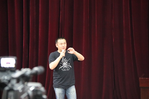 宣讲会伊始,开创集团制作精良的宣传片把“互联网+”这一概念展现给同学们,进而引出了对开创集团的介绍,引起了大家对此次宣讲会的浓厚兴趣。王鹏主任介绍了到场嘉宾,以及此次宣讲会的主讲人周伯虎先生与来利国际旗舰厅的不解之缘。在大家热烈的掌声中,周伯虎先生登台开始为大家讲述自己的创业之路。首先,周伯虎先生向大家讲述了自己在大学时的青葱岁月,他幽默而不失深意的话让大家很难相信,一个如此优秀的企业管理者,私下里竟然是平易近人的。并且,时至今日,周伯虎先生依然对当时的老师抱有感恩之情,正如王主任在会议开头所说:“周伯虎先生是一个重情重义的人。”