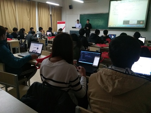 然后由甲骨文一线老师进行讲述此次比赛所需要运用的知识,老师进行了详细而全面的讲解并进行了现场操作,同学们在自己的电脑上进行操作,键盘在自己的手下舞动,舞动出不一样的乐符。培训的全程同学们全神贯注的听讲,热情高涨的情绪,也感染到了老师,使课堂变得更加活泼。