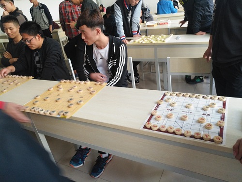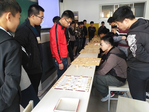 同学们拼杀了几场后,老师来到了,同学们于是在第一排一字排开,老师对战众多同学,即使是这样,PK的速度仍然不减,老师总能迅速的走出最好的一步,老师不在时每个人又是陷入沉思来应对下一步,这确实称得上一场体力与智力并存的博弈,每个人都用尽全力,每个人都专心致志。