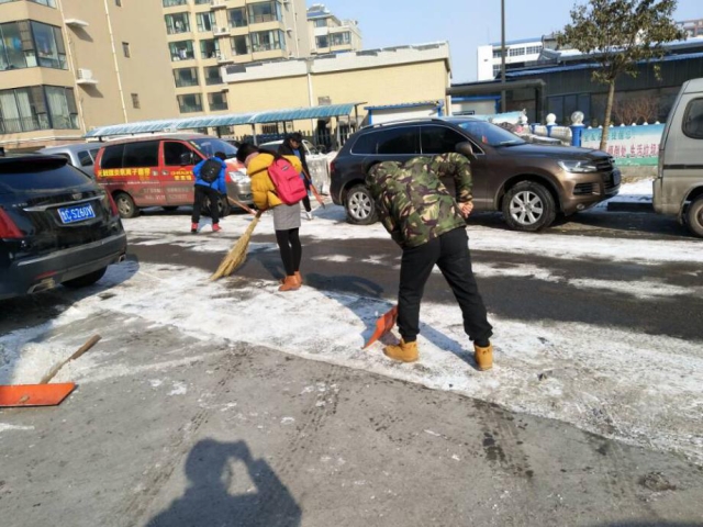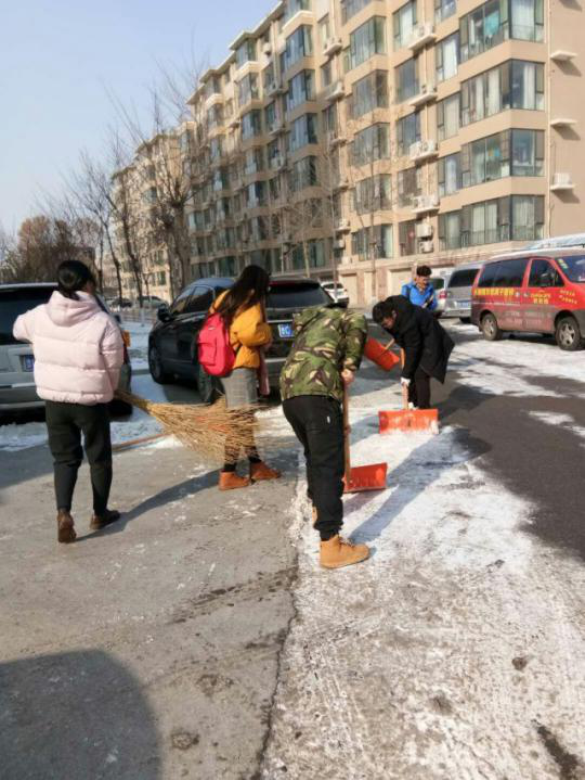随后,公司负责人请保洁负责人帮实践队员找好工具,并细心准备好手套,手把手教成员如何使用工具,传授经验。实践队员领好工具,仔细分工,切身体验扫雪除冰。虽然辛苦,却乐在其中。虽然没有做到“路见本色,黑白分明”,也是清理出供人们行走的道路,体会到物业工作人员的辛苦,锻炼了成员的意志。