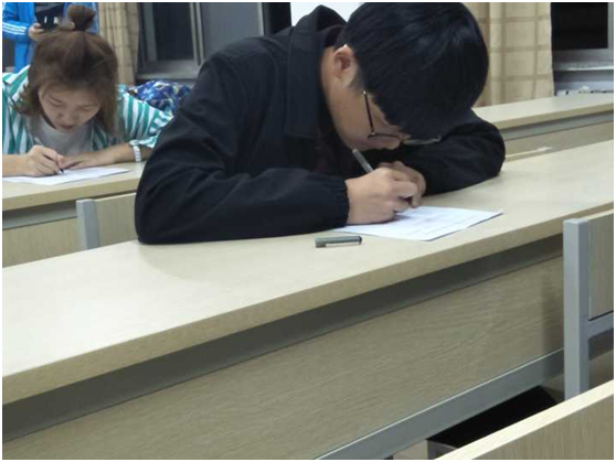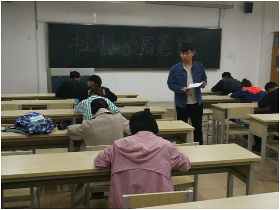 笔试伊始,马志远为竞选者依次排位并讲述笔试规则和时间,要求诚信考试、实事求是、认真对待换届笔试考试。随后各位部长为竞选者们分发试题,笔试正式开始。为了保证笔试的绝对公平性和公正性,监考人员和参加笔试者一率按照考试规定将手机处于关机状态。考场里鸦雀无声,但竞选者们都拿出自己的真正实力,目不转睛地盯着自己的试卷,都希望能拿到更高的分数。