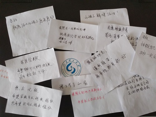 游戏环节,团支书为每位支部成员分发一张带有山理工校徽的纸片,每位同学在纸片上写出了自己想去的地方,以及对母校想说的话,每位成员都在王志良学长的感染下,认真思考,同时感受到母校的发展,今天我以山理工为骄傲,明天山理工以我为自豪。