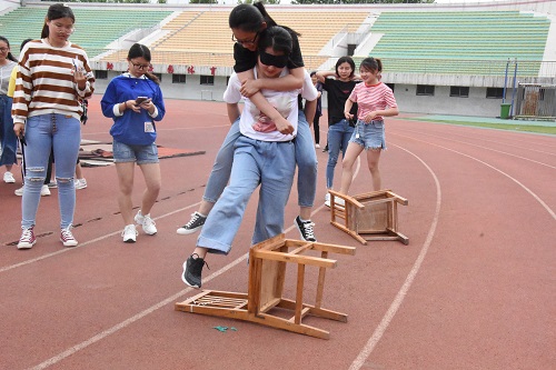 整个活动分为爱的聚拢、蒙眼障碍行、合力吹气球、袋鼠跳、同心相传六个环节。哨声一响,各个团队争分夺秒,开始分别奔向六个不同的比赛项目地点。六个不同环节不仅考验了同学们的体力和应变能力,更是锻炼了彼此之间的信任程度和团队协作能力。同心相传项目中,许多女同学丝毫不畏惧,稳住筷子中的乒乓球之后后,途中乒乓球一次未掉,赢得了观看者的阵阵热烈掌声,在赛事之外更是传递了拼搏精神,带来了感动。各项趣味游戏在一定程度上增强了同学们的身体协调能力和协作精神。