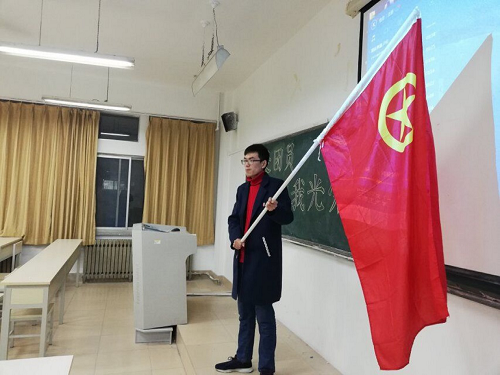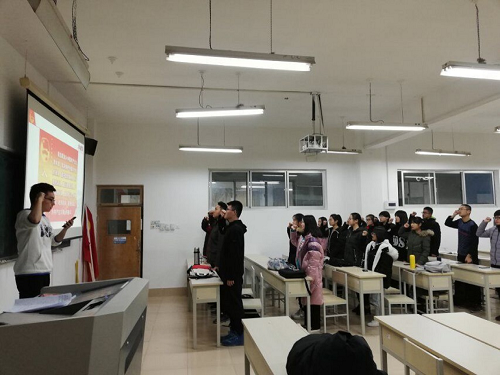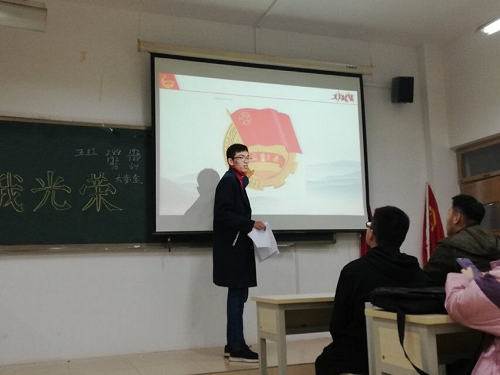 随后,马金鹏为大家介绍了社会主义青年团的发展历史,从”一大“十七大”的发展历程,在讲解过程中,团支部全体成员在班委郝文轩的带领下重温入团誓词,并全体起立合唱团歌《光荣啊,中国共青团》。团支部成员凝视团旗,唱团歌,严肃而认真,真正体会到了身为一名共青团员的光荣与自豪,牢记入团誓词,并将其付诸实践成了全体成员的目标。