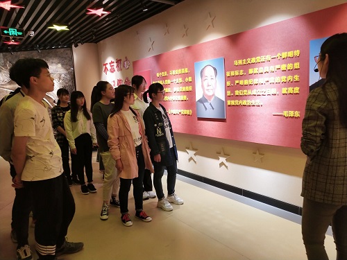 此次党课的主题是组织生活。在党群服务中心,讲解员带领同学们步入展厅,浏览墙上悬挂的新闻图片、历史记录和文字说明,并进行讲解。同学们紧紧跟随讲解员的步伐,认真聆听。随后,团支部副主席杨艳玲领誓,大家学习入党誓词。