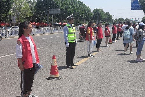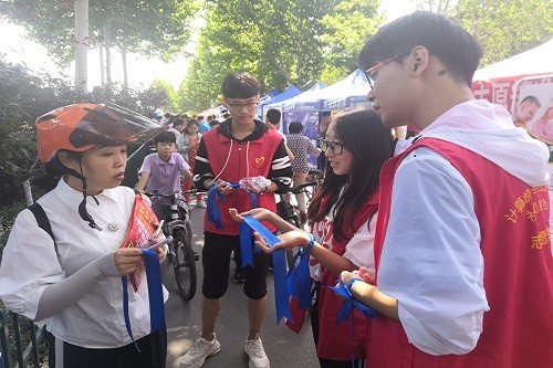 活动伊始,志愿者团成员横挂条幅,搭建帐篷,准备饮用水等,为助力考生提供充足准备。临近考试,志愿者们穿上志愿者服,为考生提供一切尽可能提供的帮助,提供饮用水,加油助威等,让考生以最完整的态度,最高昂的情绪去应对高考。考试期间,家长们在考点外等待自己孩子考试结束,考生与家长虽处于不同的场景,却有着同样的心情,同样的期望,志愿者团的成员们随机采访考生家长,了解家长对高考的态度与对孩子的期望,并给家长系上蓝丝带,寓意幸运,美好。每科考试结束后,志愿者们一部分人帮助交通警察去维护考点校门口的交通秩序,并向交通警察提供纯净水,一部分人员等待考生出场,随机为考生系上蓝丝带,另一部分人员进行考点外的场地洁净维护,并应对考生可能出现的任何问题,提供帮助。志愿者活动随着高考的结束而结束,全体志愿者们进行合影留念,并对场地进行整理收拾。