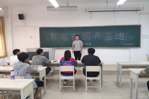 宣誓完毕后,刘为博带领成员前往9号教学楼207室,进行主题为“我与祖国共奋进”的演讲比赛。班委作为评选人,部分成员参赛。参赛成员需脱稿进行上台演讲,期间评委会指出演讲者不足的地方,并鼓励改善不足,每个演讲结束之后,评委对他进行打分,现场氛围严肃。所有演讲者演讲完之后,评委首先进行对整体演讲的评价,鼓励大家日后勇于演讲,然后对成绩进行统计,评选出优异的演讲人并颁发奖品。