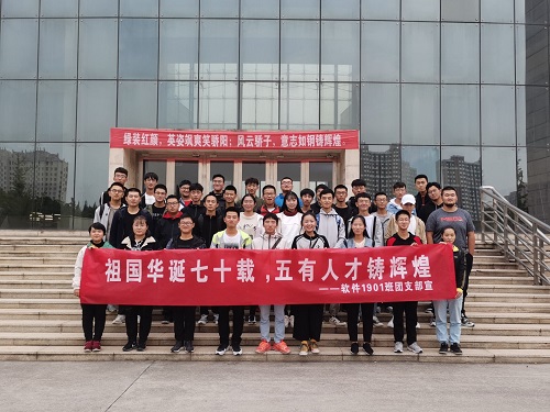活动开始,团支部全体成员去观看主题园内展览,了解历史上有“五有”精神的革命先烈。观看过后,部分同学交流各自的感悟与心得,并不断赞叹这些烈士,励志要向这些先烈学习。随后大家拿出印有“祖国华诞七十载,五有人才创辉煌”字样的横幅在图书馆东门合影留念。