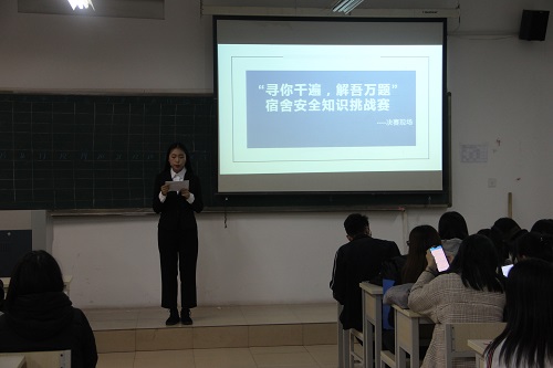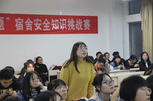 比赛伊始,主持人向同学们讲解了比赛规则并强调了比赛秉持公平公正原则。首先,每个参赛小组推出一位代表对本组宿舍学风建设进行讲解,分别从宿舍文化、学习、安全等多个方面介绍宿舍,同时表达对于宿舍生活的体会与感悟。接着,每队各派出一位队员,回答随机问题,各参赛者应对自如,熟练掌握宿舍安全相关问题。第三环节要求参赛者们共同起立回答问题,参赛者们积极参与,踊跃回答,充分体现了参赛者们对于宿舍安全知识的丰富知识储量。最后,比赛进入小组互动环节,前一组参赛者回答问题后可任意指定一小组回答问题。参赛者们对答如流,比赛进行得如火如荼。