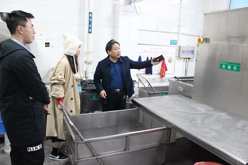 随后,餐厅经理带领权益部参观后厨的活动,工作人员带领同学们走进食堂后厨查看操作间和采购部原材料库房,重点了解了饭菜制作、餐具清洗消毒以及原材料验收储存等各环节,让同学们对食堂内部的运作有更直观和深入的了解。