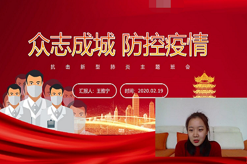 2月19日,团支部书记王雅宁在网上直播主题团课,从四个方面(什么是新冠肺炎、新冠肺炎的症状、当前疫情形势在家如何做好预防)向支部成员介绍新冠肺炎疫情防控的相关情况。为提高网上团课效果,组宣委员都少杰,自己制作新冠肺炎防护手册分享给大家,呼吁大家坚定战“疫”信心,杜绝侥幸,科学预防,理性看待,不焦虑不恐慌,从“我”做起,为打赢疫情防控阻击战做出贡献。