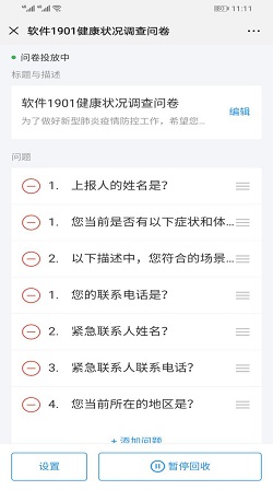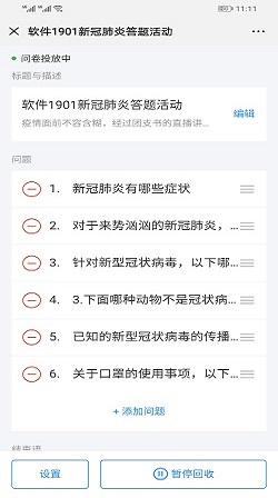 为响应“停课不停学”的号召,副书记高鹏在班级群中号召支部成员防疫期间自律生活,每天坚持学习与运动打卡,并充分利用好“学习强国”等网络平台认真学习国家对疫情防控的各项指示精神,号召同学们在家适当锻炼,提高免疫力,抵抗病毒,减少焦虑情绪,同舟共济,共克时艰。面对疫情,团支部以大家的身体健康为出发点,相继进行了问卷调查、新冠肺炎相关知识竞赛等系列活动。