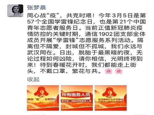 此次团日活动引导团支部成员及时关注疫情最新动态,提高了同学们的安全意识和疫情防范技能,进一步培养了团支部成员的奉献意识。班级同学们也更进一步地感受到了新时代青年所肩负的时代使命,领悟到了雷锋精神所蕴含的时代内涵。让我们同心战‘疫’,共盼春暖花开。