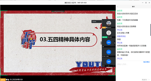 此次团日活动中,李记龙先带领同学们观看了哔哩哔哩的视频“奔涌吧!后浪”,随后点出并讲明本次活动的主题,即青年们应该学习的五四精神。同时李记龙讲解了五四精神的含义及出处,帮助同学们更加理解五四精神所蕴含的力量。随后李记龙解释了青年不畏艰险的精神和无所不往的勇气,并与同学们一同观看祖国的抗疫历程和抗疫故事,了解了此次抗疫中年轻力量的强大之处——即青年们的努力和无畏。