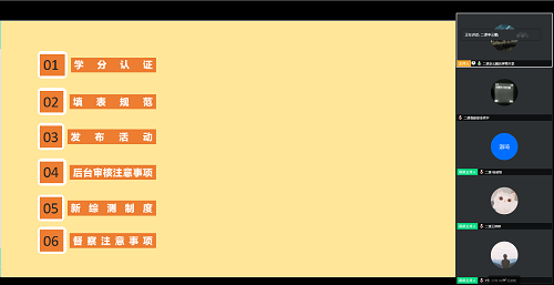 紧接着,杨淑琦介绍了活动中的督查流程,依次从活动报名阶段、活动开始后、活动结束后、活动完结这四个步骤为大家说明可能出现的问题以及相应的解决措施。随后,她为大家介绍了公司综测改革中计算第二课堂成绩单的改动部分,鼓励大家尽快将第二课堂成绩修满八分。最后,她讲解到:大家在网上填报流程时,需要严格遵守公司的相关规定,按照校级、院级以及班级的团日活动的对应级别的要求进行,并且建议大家留意、总结申请表驳回原因。此外还介绍了到梦空间的相关规定和活动进行流程等。