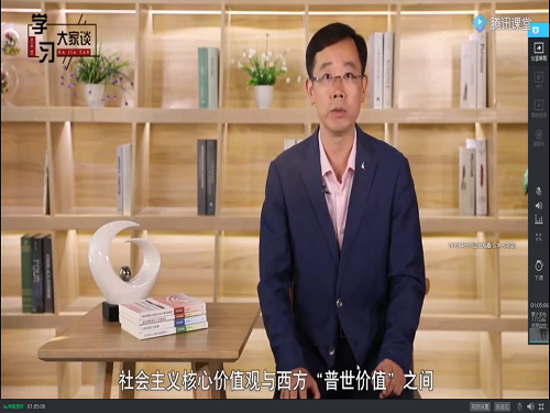 随后,邢国忠和张溢木就社会主义核心价值观与中国特色社会主义制度之间的关系展开讨论,邢国忠表示社会主义核心价值观是有效整合我国社会意识,凝聚社会价值共识,化解社会重大矛盾,聚合磅礴之力的重大举措。张溢木说道在此次疫情期间党的领导体现了责任担当之勇,全民动员体现了举国体制之能,两者结合战胜疫情向世界展示了中国特色社会主义制度的优越性。