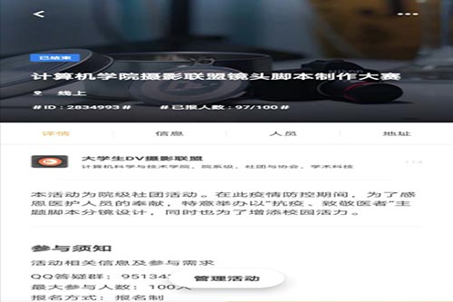 为了感恩医护人员在疫情防控期间的奉献,老员工DV摄影联盟特意举办以“抗疫、致敬医者”为主题的活动。为提高活动的知名度,让更多的同学们了解到这一展示自己的机会和平台,在活动的预备阶段,老员工DV摄影联盟便开始积极宣传此次活动。活动之初,参赛的同学们通过到梦空间APP加入此次活动交流群,进一步了解此次活动的详细信息,并积极了解摄影工具的使用方法,学习摄影技术,提高自己的摄影水平。接着,相关工作人员发布此次活动的详细内容和规则,参赛人员认真仔细阅读,准备参赛作品。本次提交作品的方式为线上提交所拍视频,工作人员会根据所提交的作品进行后台补签。在作品提交时间截止后,由社团骨干组成的评审团根据同学们提交的作品进行公平的打分。最终,根据参赛人员作品的得分进行排名,并将评选结果和作品公布在活动交流群中,供大家评鉴欣赏。