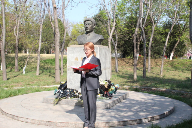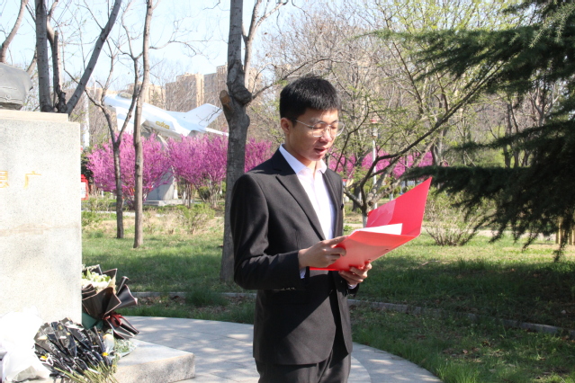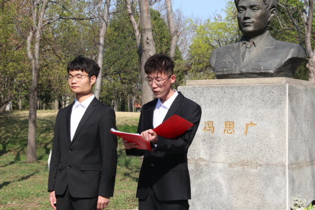 宣誓完毕,员工代表付文聪进行讲话,告诉同学们,“虽然冯思广烈士长眠于地下,但历史不会忘记他们,我们更不会忘记他们。我们要牢记使命,以实际行动过向革命先烈致敬”。