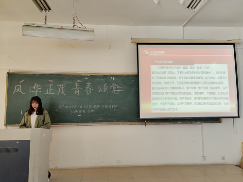 活动伊始,由高胜蓝主持展开主题班会。她首先以主题课件的形式向同学们讲解什么是五四精神,加深同学们对五四运动历史意义和时代价值的认识,并围绕献礼中国共产党成立100周年、继承发扬“五四”精神和践行“五有”人才培养目标,通过一些事迹号召同学们继承和发扬五四精神,激励同学们树立远大理想,敢于积极承担时代责任,拼搏进取,奋发图强。接下来高胜蓝带领大家观看了“青年之问:关于人的一生应如何度过”以及“罗翔老师对于青年人的两条建议”的视频,视频联系当下,探明五四运动对当代青年的深远作用,让同学们认识到发扬五四精神不仅是挖掘五四精神的实质和内涵,更要把握五四精神的时代价值,并将其转化为当代青年的精神力量。