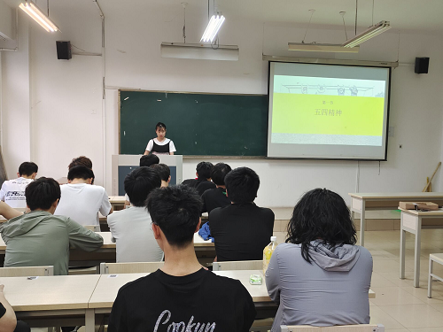 此次活动分为开展主题班会、邀请同学上台讲述五四故事、后期录制五四视频三个部分。活动伊始,由高浚潇以课件的形式向同学们诠释五四精神的由来及深刻含义,以加深同学们对五四运动历史意义和时代价值的认识,五四精神以爱国、科学、民主、进步为主要内容,这种精神特质对中国思想和中国文化的转变和发展意义重大,对于中国在历史发展的现代化进程中也影响深远。接下来,高浚潇通过分享伟人事迹简述了什么是五有人才,并号召同学们继承和发扬五四精神、争做五有人才,练就过硬本领,培养爱国之情、实践报国之行,扬光荣传统,传承时代伟力。