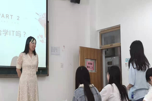 讲座伊始,企业导师从IT职场上适合女生的工作类型以及女生想要的生活进行了分享。她提到在IT行业里,女生可以发挥自己的性格优势,以认真、仔细、有耐心、善于沟通、注重细节、良好的审美观等特性对待IT行业,从而融入到行业中。随后,企业导师讲解适合女生的岗位包括设计类岗位、数据分析类岗位、测试类岗位、产品经理岗位等,同时她对本专业的学习,提出了自己的意见和建议,认为在学习上要有精益求精的精神,时刻保持沉着冷静的心态等。