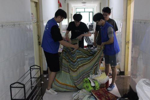 紧接着,志愿者按照规定,有序前往宿舍楼,为毕业生提供帮助。根据事先安排的分组,志愿者们积极开展活动,为毕业生提供帮助。活动中,志愿者为毕业生参与捐赠活动、书籍和废品等物品的搬运工作提供帮助。志愿者们将宿舍大厅内的遗留物品进行搬移,并对宿舍里的桌子、生活用具等物品进行清扫,帮助毕业生清理宿舍楼。