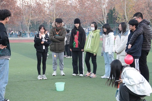 活动初始,进行活动开幕式,工作人员讲述活动规则与活动内容。活动首先进行你画我猜游戏,同学们需要用图画的形式展示自己看到的词语,并让队友猜出。由工作人员展示图片,每队出一部分人共同作画,完成后向剩余部分成员展示,期间不能有语言,肢体等任何方式交流,最后给出猜测的答案,并且不可以在图画中出现任何形式的文字。这个游戏加强了同学们之间的团结合作,拉近了大家的距离。并且可以锻炼人的想象力,动手能力,也能增加趣味性。紧接着,大家进行了夹气球跑游戏,即每队分成数个两人组,背靠背夹着气球由起点跑向终点,用时和最小的组为获胜者。途中不得以手、臂碰球,如有违反均视为犯规,同学们之间互相鼓励,合作默契。这个游戏不仅增强了同学们的集体荣誉感和合作意识,而且树立了相互配合、互相支持的团队精神和整体意识。