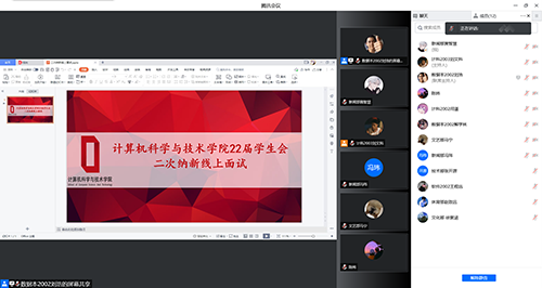 面试开始前,各部门竞选者积极准备自己的演讲稿,调适自己的麦克风和摄像头,择取最佳背景,耐心等待面试。会议伊始,主持人简述面试流程,此次面试包括竞选者自我介绍和部门负责人问题提问两个环节。随后,竞选者按照名单顺序依次进入线上会议室参加面试。面试同学针对自己的性格特点、竞选理由、任职经历以及获奖荣誉进行简要介绍,并客观分析了自己存在的问题和不足,作出自己对于部门的认识和憧憬以及未来的部门工作规划。